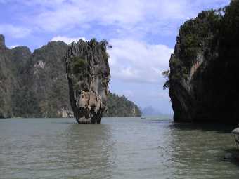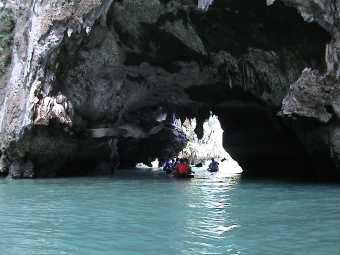 The best trip we (with Jacqui and Sue) did was with Singh Sea Canoe to Phang Nga Bay. Phang Nga Bay is National Park and is made up of literally thousands of islands, some of then very small and most of them uninhabitable. First we had a lovely cruise on a big boat through the bay from Phuket to James Bond Island (not the original name (Khao Ping Gan) but yet another example of cashing in – the “Man With The Golden Gun” shot some scenes here in 1974). We were transferred to James Bond Island by Longtail boat. The boat held about 20 people comfortably and we were wondering where the second boat was but in the end (God knows how) they got about 35 of us onto the boat (the Thais have that nack for finding spaces where they don’t seem to exist) and we felt we would sink but in the end we just got wet. James Bond Island was spectacular – just like thousands of other