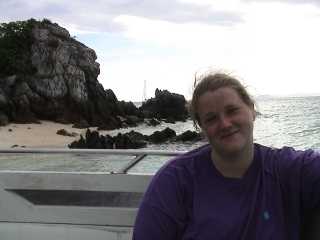 islands in the area except that this one had hundreds of tourists on it and consequently lots of tacky stalls and lots of people eating dried squid (yes really). For some reason dried squid can be found everywhere in Phuket but it looks and smells foul so I haven’t been game enough to try it yet – What do you think my chances are of getting Richard to try it? The best bit of the trip was being canoed around the caves of two islands (Hong and Panak). Three to a canoe, us and our guide/driver who did a wonderful job of pointing interesting things out to us – the rock that looks like a fish, the rocks which look like they have diamonds in them, the mangrove trees, the BATS! He took us around some beautiful caves, through the darkness into the bright sunlight of wonderfully peaceful clearings where the cliffs rose above us (covered with green trees and flowers), the sun shone above us and the green water glistened beneath us. Our guide always tried to stay behind the pack of other canoes so often it was just us and it was so quiet and beautiful – it can’t really be explained well enough. In the afternoon we got some time to play about in the canoes ourselves at yet another beautiful island (Richard and Jo won the splashing contest – don’t believe Sue and Jacqui!). The guides from the boat had found a coconut on the beach and opened it up – so we looked longingly at it and were given some: fresh coconut, yum, yum! (mostly coconut here is served for the milk – very young and the flesh is soft). Only a little blood was spilt getting the flesh out – Jo took over and did it properly after that.
